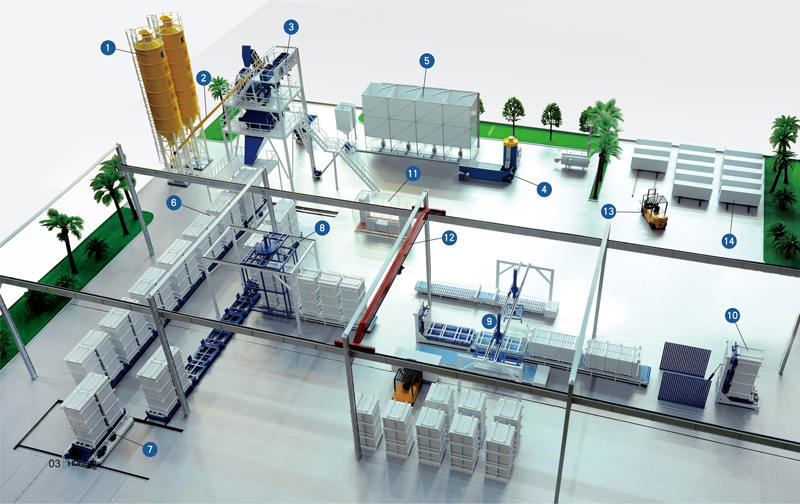 生產(chǎn)線介紹 立式子母模板生產(chǎn)線使用子母模進行全自動成型及養(yǎng)護循環(huán)生產(chǎn),所用原材料可以是EPS顆粒,XPS顆粒,陶粒,改性珍珠巖等輕質(zhì)材料,成品是輕質(zhì)復(fù)合保溫墻板。 該生產(chǎn)線是由全自動配料機,物料計量和輸送設(shè)備,連續(xù)式攪拌站和注料系統(tǒng),子母模車,擺渡車和翻機,拆模機等組成。 特點 由于子模和母??煞蛛x式設(shè)計,母模在線,子母可以集中到養(yǎng)護室養(yǎng)護,母??梢猿兄硗獾淖幽嗬m(xù)運轉(zhuǎn)。這樣就不會因為在線養(yǎng)護,對場地及生產(chǎn)規(guī)模的約束和局限性,可以在有限的場地上實現(xiàn)較大的產(chǎn)能。 配置介紹 1、立式:立式模具,模具立式注漿 2、子母模(又稱子母模具車),其中子表示模組,母表示模具行走車 3、一臺子母模具車包含二個子模具和一個模具行走車 4,模具自動翻轉(zhuǎn)平臺 5,專用拆模機械裝置 配套設(shè)備 1、水泥筒倉 2、螺旋輸送機 3、攪拌系統(tǒng) 4、EPS預(yù)發(fā)機 5、EPS儲存?zhèn)} 6、立模車 7、擺渡車 8、旋轉(zhuǎn)機 9、脫模系統(tǒng) 10、自動翻板機 11、控制系統(tǒng) 12、行車 13、叉車 14、成品堆放場 |