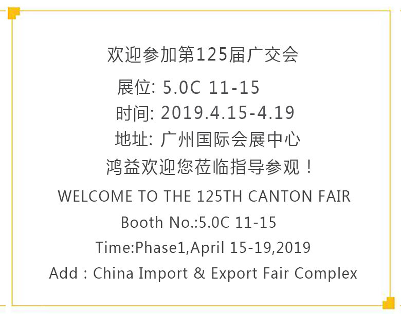 創(chuàng)新科技,行業(yè)領(lǐng)先!鴻益機(jī)械連續(xù)20多屆參與廣交會(huì),2019春季中國(guó)進(jìn)出口產(chǎn)品交易會(huì),再次如約而至。鴻益機(jī)械帶您領(lǐng)略科技創(chuàng)新技術(shù),歡迎全球新老顧客蒞臨參觀指導(dǎo),鴻益機(jī)械期待您的到來(lái)!