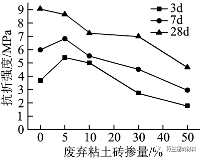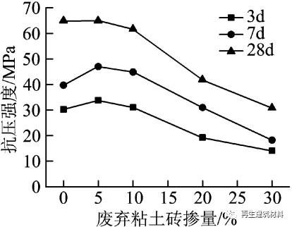 (3) 摻量大于 10% 后,廢棄混凝土水泥膠砂強度較廢棄粘土磚水泥的高。廢棄混凝土中含有部分未水化的水泥顆粒, 具有一定的水化活性。同時廢棄混凝土中碳酸鈣含量高, 在水化過程可與熟料的C3A 和 C4AF 反應生成水化碳鋁酸鈣 , 可以與其他水化產物相互搭接,使體系結構更加密實,增強體系的強度。