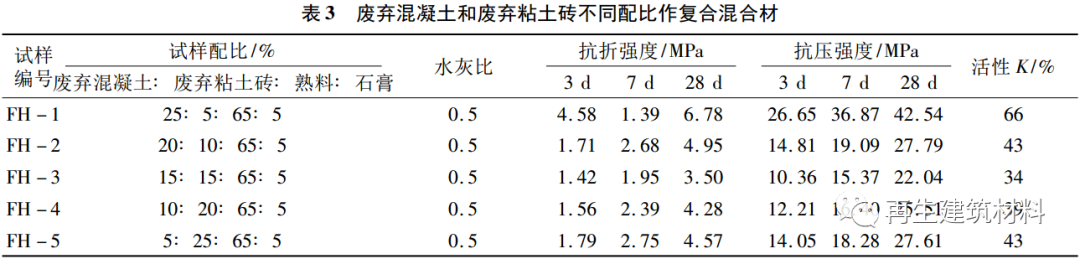 (1) 水泥熟料摻廢棄混凝土和廢棄粘土磚作混合材,降低了水泥熟料的強度。究其原因,水泥強度主要來源于水泥熟料的水化產物 C-S-H 強度, 因廢棄混凝土和廢棄粘土磚的水化活性不及水泥熟料,樣品水泥總體的水化活性有所降低,降低了水泥強度。